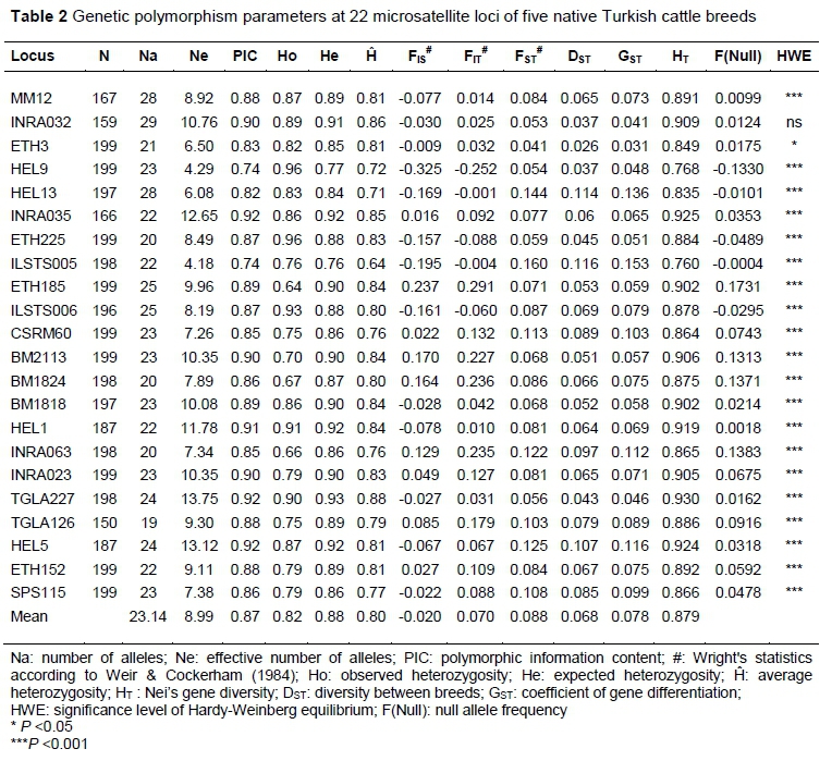 The FIS values for the overall populations suggest a moderate level of gene flow between breeds. Low FISvalues for each breed revealed high heterogeneity in Turkish native cattle breeds, and the highest FIS value of 0.064 was observed in the NBC breed. Similar findings for this breed were reported by Özsensoy (2011) and Semen et al. (2019). Negative FIS values (Table 3) may refer to heterozygote excess (Shane, 2005).