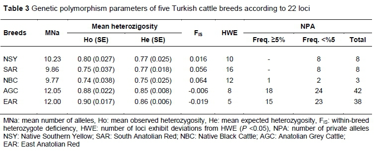 Considerable genetic variation was detected within and among breeds of Turkish native cattle (Tables 2 and 3). Loftus et al. (1999) reported that genetic diversity in cattle breeds from the Near East was greater than European breeds. Total numbers of alleles and alleles per locus were greater than previously reported for native cattle from Brazil (22 microsatellite markers, 278 alleles) (Egito et al., 2007), Turkey (20 microsatellite markers, 274 alleles) (Özsensoy et al., 2010), Korea (30 microsatellite markers, 276 alleles) (Suh et al., 2014) Indian (21 microsatellite markers,359 alleles) (Sharma et al., 2015), and South Africa (22 microsatellite markers, 199 alleles) (Sanarana et al., 2016). The MNa were fewer for SAR (9.86), NBC (9.77) than was observed by Özsensoy et al. (2010) with 11 loci. However, MNA for NSY (10.80), AGC (12.55), and EAR (12) were greater than in the previous study (Özsensoy et al., 2010). MNA were also greater than had been observed by Loftus et al. (1999) for Turkish native breeds of cattle. It could be said that Turkish native cattle breeds are genetically diverse.