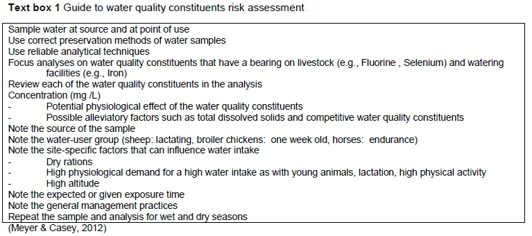 Determining fitness-for-use of a groundwater source in the livestock context is important as it directs decision making regarding which groundwater sources are most suited to a specific livestock group. Livestock in various production phases differ in resilience to poorer quality groundwater. The toxicity of WQC depends on the intake rate and exposure time, the physiological state of the animal, and the interaction between WQC in the water.