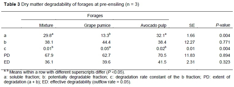 Dry matter degradability of the forages before ensiling is shown in Table 3. The AP and its mixture had higher (P <0.05) soluble fractions compared to that of the GP (13%). However, the potential degradable fraction and the extent of degradation did not differ amongst the three forages. The degradation rate was higher (P <0.05) in the GP compared to the other two forages.