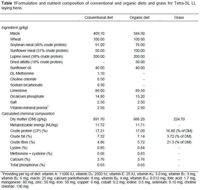 Birds of group CON and FR were fed ad libitum with a commercial mixed diet. Hens in the ORG group were given organic feed ad libitum. Conventional and organic feed mixtures were prepared with maize, wheat, soybean meal, lupine seed, sunflower meal and sunflower oil (Table 1). Similar ingredients were used when formulating diets to avoid discrepancies in ingredients and nutrient compositions between systems. At least 90% of the dry matter content of the organic feed mixture was provided from organically grown ingredients (EC Regulation 834/2007). Genetically modified soybean meal was the only conventional feed ingredient in the organic feed mixture. The diet for ORG hens was complete without the addition of synthetic amino acids. The diets were iso-energetic and iso-nitrogenous, and drinking water was always available. In the FR and ORG systems hens were able to supplement their diets with vegetation and small fauna. When the hens were 30, 33, and 36 weeks old, samples of grass were cut from random locations in the areas in which the hens were pastured. The chemical compositions of the feed and grass were determined according to AOAC (1999).
