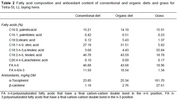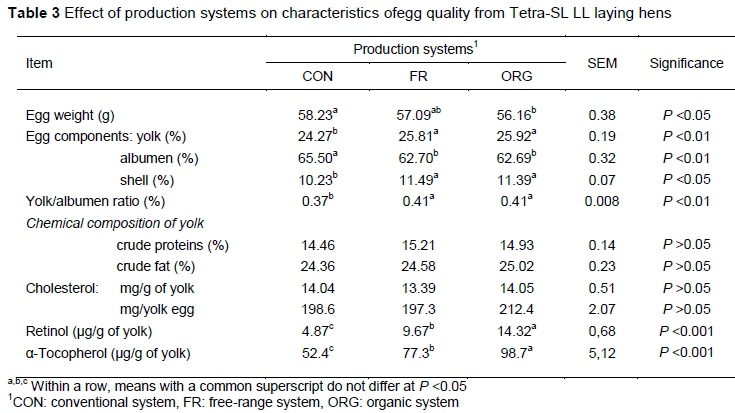Variation in the quality of eggs exists when hens are kept in CON, FR, and ORG production systems. The FA composition of the yolk was affected significantly by access to pasture. Access of hens to pasture in the FR and ORG production systems provided a good source of FA n-3 and antioxidants, which improved the oxidative stability of lipids in egg yolk. However, the small differences that were observed between the FR and ORG production systems are unlikely to have effects that can be detected by the consumer. The improved FA profile of eggs from FR and ORG may counterbalance the loss of egg weight. Some constituents of grass may be of interest to produce eggs that are rich in n-3 FAs, retinol and a-tocopherol, which increase the quality without adverse oxidative effects.