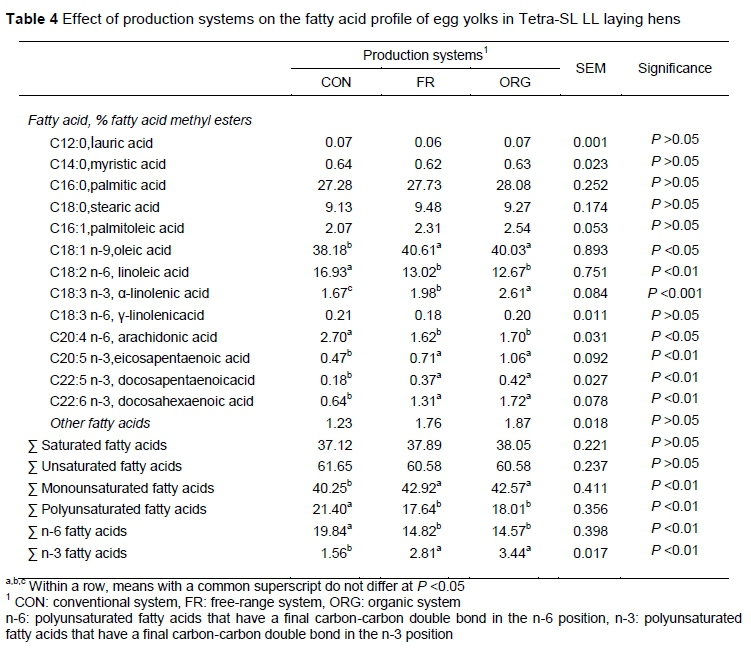 Similar to the results of this study, Lopez-Bote et al. (1998) reported that eggs produced by hens in the free-range system had higher omega-3 (2.6-fold) and lower omega-6 contents compared with the conventional system. They attributed this to the availability of pasture that was rich in omega-3 and low in omega-6 FAs. Eggs produced in the ORG system had a higher omega-3 compared with those from the CON system, but were similar to eggs from the FR system (P >0.05), despite the hens in the ORG system having a larger area of pasture as a source of n-3 FAs. The higher PUFA n-3 content of eggs produced in the FR and ORG systems could be associated with outdoor access, because factors that increased the proportion of PUFA n-3 in egg yolk included consumption of fresh grass and invertebrates (Campos et al., 2016; Matgorzata et al., 2017). Green forage is a source of relatively large amounts of n-3 Fas and fat-soluble nutrients, which can ultimately be transferred into the yolk (Sokotowicz et al., 2018; Krawczyk et al., 2013). These results highlight the functional similarities of the eggs from these systems of production.
