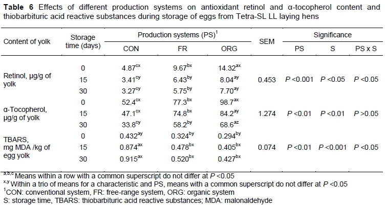 The correlation analysis showed the potential relationship between PUFAs and retinol and tocopherol content and lipid oxidation of storage eggs (Table 7).The most important observation is the presence of a positive relationship of n-3 FAs with MDA, indicating that an increase of n-3 FA level accompanies an increase in MDA (P <0.01). In addition, negative correlations of MDA concentration with retinol and a-tocopherol levels in the yolk indicated that carotenes and tocopherols from fresh grass have positive potential as natural antioxidants and could contribute to preventing lipid oxidation in egg yolks.