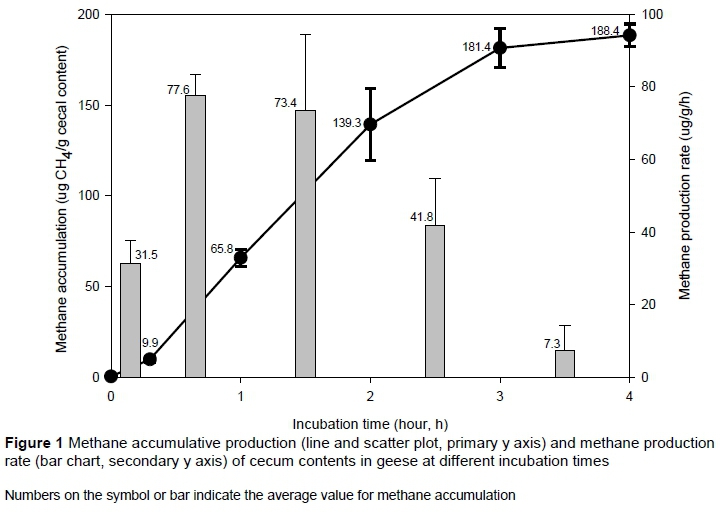 The aim of Experiment I was to study the CH4 production (accumulative amount) from the cecal contents of White Roman geese under six incubation times (0, 0.3, 1, 2, 3, and 4 hours) (n = 5). The test for each incubation time had five replicates. Ten randomly selected 14-week-old birds were slaughtered to collect a mixture of cecal contents. In each test, 1 g cecal content was put into a 15-mL vial containing 3.25 mL of full-strength (1x) nutritive buffer solution (Salvador et al., 1993). The vials were filled with 100% CO2, sealed with butyl rubber stoppers and aluminium caps, and incubated in a 38 °C shaker (80 rpm) under anaerobic conditions. At the end of each incubation time, 0.2 mL of 10% chloride mercury (HgCl2) was added to the vials to terminate bacterial activity. Biogas from each test was sampled from the vial with a gas-tight syringe to measure CH4 concentration.