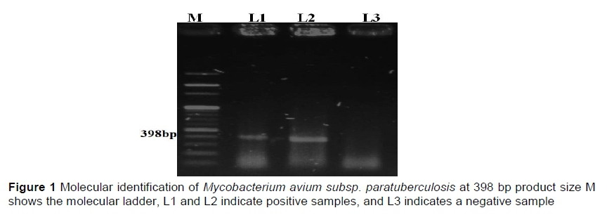 Faecal samples were collected and processed for DNA extraction through the boiling method (Alexopoulouet al., 2006). PCR was performed for rapid diagnosis of MAP following Stanley et al., 2007. A set of primers (P90 GTTCGGGGCCGTCGCTTAGG, P91 GAGGTCGATCGCCCACGTGA, IS 1245 F GTGGGCAATCTGCCCTGCACTTCGG, IS 1245 R GCCCGCACGCTCACAGTTAAGCCGT) reported by Bartos et al. (2006) was used with the recipe as DNA (3 μL) master mix (Enzynomics) 20 μL, primer (F+R) 1 μL each. Thermocycler (Qantarus) was set at preliminary denaturation (94 °C for 2 minutes), 35 cycles of denaturation for 30 seconds, annealing (65 °C for 2 minutes), and three elongations (3 minutes at 72 °C). At the end of the last cycle, 30 seconds of denaturation, two minutes of annealing at 65 °C and a final extension at 72 °C for 10 minutes were carried out (Stanley et al., 2007).