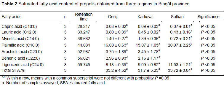 Table 3 shows the unsaturated fatty acid content of samples from Genc, Karliova and Solhan regions. Although there were no significant differences between Genç, Karliova and Solhan in the amounts of oleic acid, linoleic acid, and total monounsaturated fatty acid, the amount of linolenic acid varied between the regions. As a consequence, the total polyunsaturated fatty acid was higher in samples from Solhan than from the other regions. Digrak et al. (1995) identified eight fatty acids in propolis samples from Elazig, namely capric (0.74%), pentadecanoic (0.30%), palmitic (9.6%), stearic (2.72%), linoleic (0.42%), arachidonic (1.26%), eicosapentaoneic (2.60%), and nervonic acid (15.8%). Shakya et al. (2018) identified these fatty acids in propolis produced by bees in Jordan: palmitic (44.5%), arachidic (7.4%), steraic (5.4%), linoleic (3.1%), caprylic (2.9%), lignoceric (2.6%), cis-11,14-eicosadienoic (2.4%), palmitoleic (1.5%), cis-11-eicosenoic (1.2%), α-linolenic (1.1%), and cis-13,16-docosadienoic (1.0%). §ahinler & Kaftanoglu (2005) reported that propolis contained caprinic acid (0.02%) and lauric acid (0.33%). Koru et al. (2007) recorded that the palmitic acid content of propolis was (0.33-2.39%) and that it contained 0.11-1.23% stearic acid as well. Koru et al. (2007) reported that propolis contained oleic acid (0.63-1.00%), α-linoleic acid (0.4%), 9-Octadecanoic acid (0.36-2.12%). Finally, Silici & Kutluca (2005) recorded the content of behenic acid as 1.02-1.88%. The diversity in these findings points to the problem of lack of consensus of the fatty acid composition of propolis.