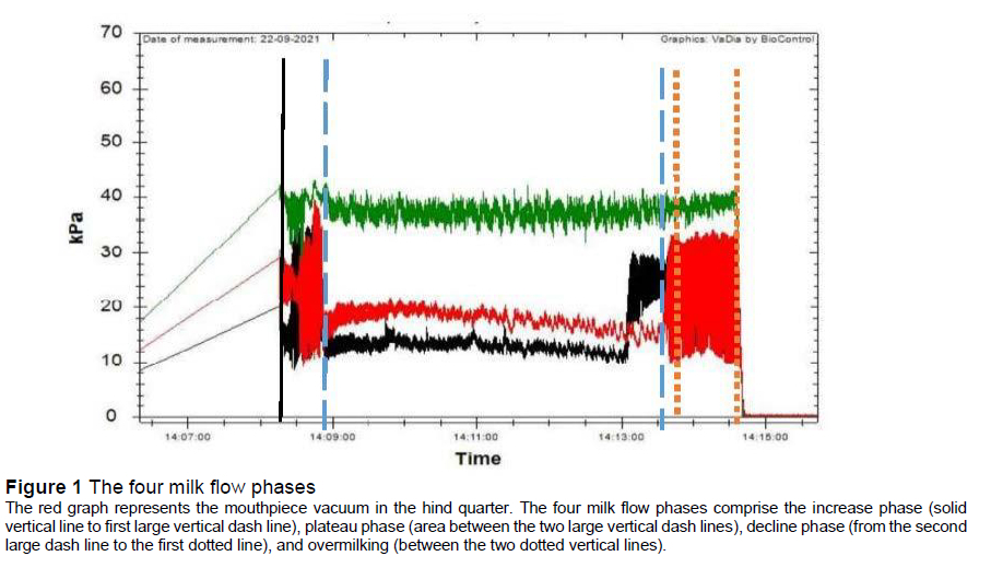 Malmo & Mein (2015) found a strong relationship between higher milk flow and lower milking unit vacuum being recorded simultaneously. Milk flow was measured with a LactoCorder (WMB AG, Switzerland) and milking unit vacuum, with the VaDia. Borkhus & R0nningen (2003) suggested that vacuum could be used to establish key points in the milking curve and that marked changes in mouthpiece chamber vacuum could identify phase changes of the milking curve, such as the start of overmilking.