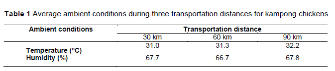 Furthermore, Nijdam et al. (2004) stated that severe bruising would not only decrease carcass quality grade, but would lead to a market rejection of that entire carcass. Thus, rough handling in transportation, changes in environmental temperature, the density in crate storage, lairage, and modes of stunning and slaughter are causes of stress and changes in chickens' muscle metabolism that will have a negative impact on final broiler chicken carcass quality. Heat and other typical stressors during transportation reduce post-slaughter poultry meat quality by intensifying glycolysis and the accumulation of lactic acid, leading to a reduction in pH (Doktor & Pottowicz, 2009; Wang et al., 2017). Breed, body size, and weight may influence the development of pathologies, affecting poultry meat tissue. Fast-growing broiler muscle differs from that of slow-growing chicken in terms of minerals and metabolic enzymes, producing broiler breast muscle of a poorer colour quality (Sandercock et al., 2009). The present research was conducted to investigate the impacts of various transportation distances on the physiological conditions and final carcass quality of kampong chickens.