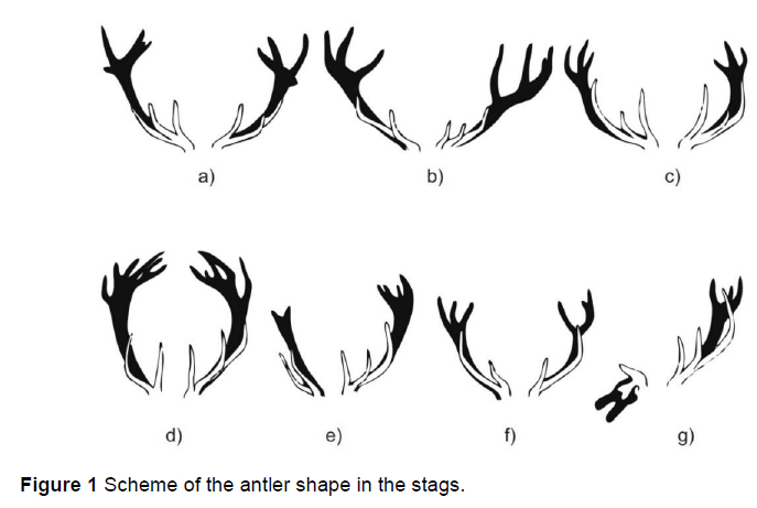 The research was carried out at the Research Station of the Institute of Parasitology, Polish Academy of Sciences, Kosewo Górne (Region of Warmia and Mazury; Poland; N: 53o48'; E: 21o23'). In the first year of the study (2017), seven red deer stags aged 2 to 9 years were observed (named: Dziki, 9 years old; Niko, 6 years old; Hubert, 4 years old; Florek and Jasiek, 3 years old; Neo and C12, 2 years old). In the second year (2018), the observations involved the same five stags (except C12 and Jasiek). Stags in both years were kept in summer paddocks in contact with a herd of 40-45 hinds. The breeding system consisted of rotational access to pasture in the paddocks with a density and nutritional scheme recommended by FEDFA (2020) and Mattiello (2009). In 2017, the herd was monitored in terms of mating behaviour. In 2017 and 2018, the frequency and duration of vocalization as well as weather conditions were recorded. At the beginning of the study, the deer were observed for 24 h to establish the time of day with the highest intensity of the vocal activity of the stags. This indicated that the observations should be carried out for one hour in the morning and three hours in the evening. The study was conducted for two months (August, September) in 2017 and 2018 from 05:00 to 06:00 and from 20:00 to 23:00 every other day. A ZOOM H6 sound recorder, a Nikon D70s camera, binoculars, and a Night Vision Scope NV5x60 devices were used to record the sounds produced by the stags and observe their behaviour. The weather conditions were recorded using a thermometer with a hygrometer and weather maps from a nearby meteorological station (Institute of Meteorology and Water Management; Maritime Department; Meteorological station). At the beginning of the study, the herd was accustomed to the presence of the observer. The observations were made at a distance of 2-10 m from the animal group; after 20 min, the animals ignored the presence of the observer. The numbers on the ear tags and diagrams of stags' antlers were used to identify the individual specimens (Fig. 1).