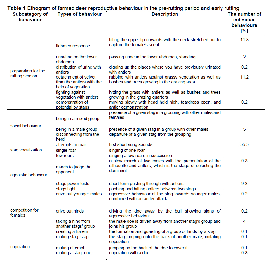 Therefore, the aim of the research was to analyse changes in pre-rut behaviour of stags and show the impact of weather conditions on vocalization and other behavioural elements in farmed male red deer that facilitate recognition of the onset of the mating season.