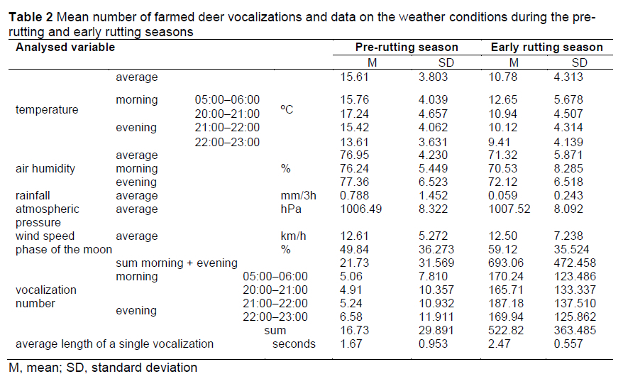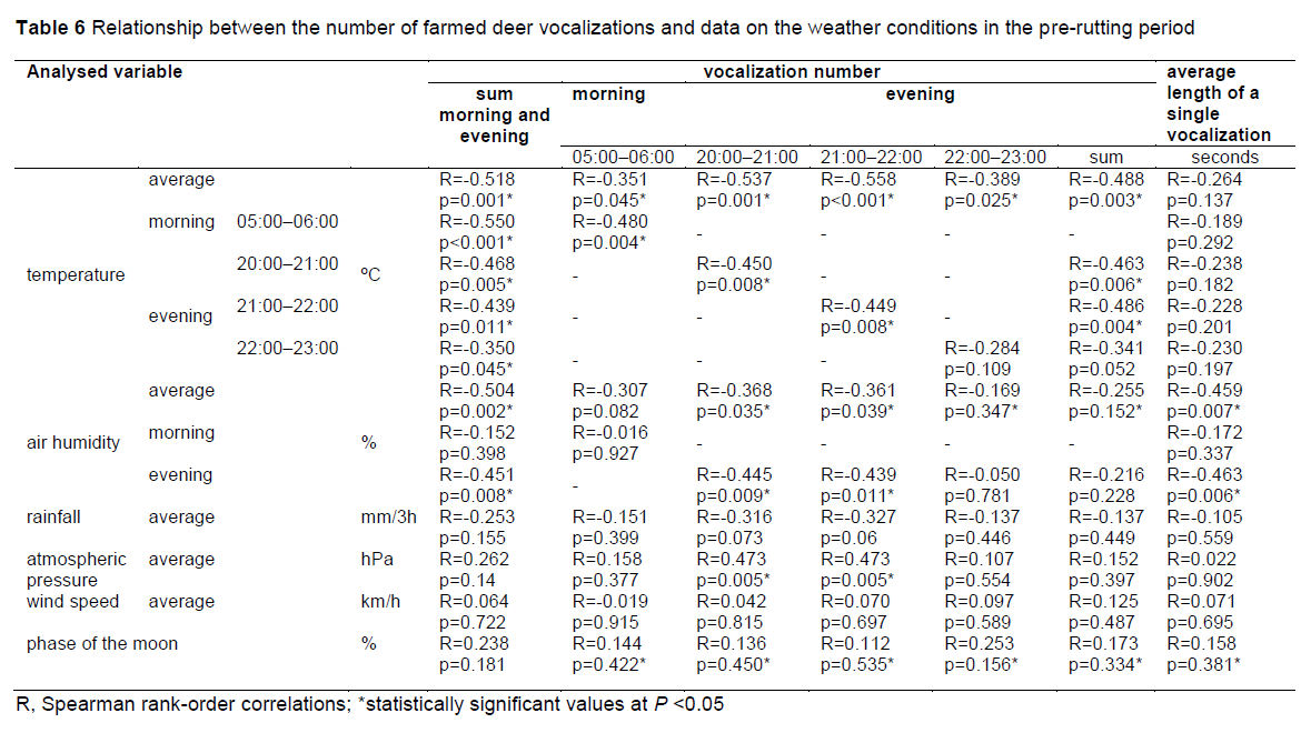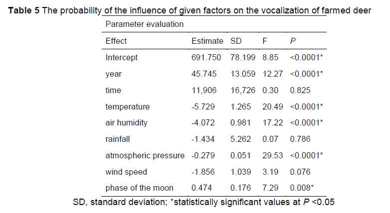 The mean number of vocalizations was almost thirty times higher in the mating season than during the pre-rutting period. In both periods, the stags vocalized more often in the evening than in the morning. Moreover, single roars were almost 1.5 times longer during the rutting season than in the pre-rutting period (Table 2). The number of stag vocalizations was compared with reference to the weather conditions prevailing in the pre-rutting period and during the mating season (Table 5, 6, 7). The influence of the year, temperature, air humidity, atmospheric pressure, and moon phase were evident on the vocalization of farmed deer (P <0.05, Table 5).