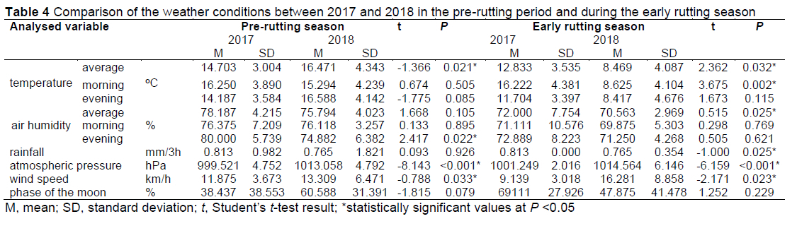 The pre-rutting period differed between 2017 and 2018 in terms of the mean temperature (lower mean temperature recorded in 2017), air humidity in the evening, atmospheric pressure, and wind speed (P <0.05). The mean temperature, atmospheric pressure, and wind force were lower in 2017, and only air humidity in the evening hours was higher than in 2018 (Table 4).