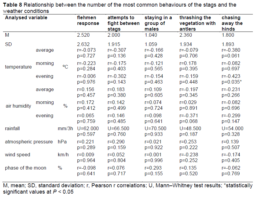 During the observation in the pre-rutting period, behaviours such as mating stag-doe, driving out the opponent, driving out hinds, chasing the hinds, detachment of velvet from the antlers with the help of vegetation, fighting against vegetation with antlers, flehmen response, urinating on the lower abdomen, being in a male group, stag fights, and a single roar or few roars per event were recorded (Table 1). The most frequently repeated behaviour was a single roar or few roars per event (55.5%). Flehmen response (11.3%), thrashing the vegetation with antlers (11.2%), and stag fights (9.3%) were quite frequently repeated as well. The rare types of behaviour included urinating on the lower abdomen (2%), taking a hind from another stag's group (4%), mating stag-doe (which was recorded on the last day of the observations) (0.3%), and driving out younger males (0.2%) (Table 1). The hinds were not chased until the beginning of September, and this behaviour was observed more frequently as the rut approached. Except for vocalizations, these behaviours were shown by the stags more often in the morning than in the evening. The relationship between the most common behaviours and weather conditions was assessed. It was shown that flehmen response, attempted fights, staying in a group, thrashing the vegetation, or chasing of the hinds by the stags did not depend on the weather conditions. Only the chasing of the hinds was negatively correlated with the mean evening temperature (P <0.05) (Table 8).