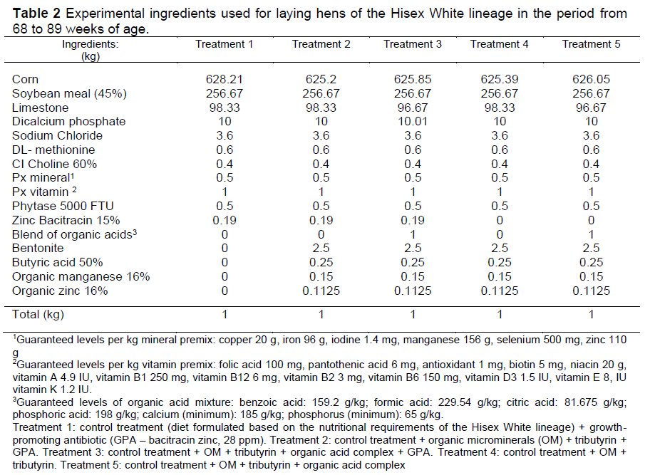 The light program used was 16 h daily of natural lighting + artificial lighting. During the experimental period, the feeds were formulated based on corn and soybean meal and were iso-nutritive except for the addition of the evaluated additives. The formulation followed the nutritional recommendations of the Hisex White lineage (Tables 2 and 3).