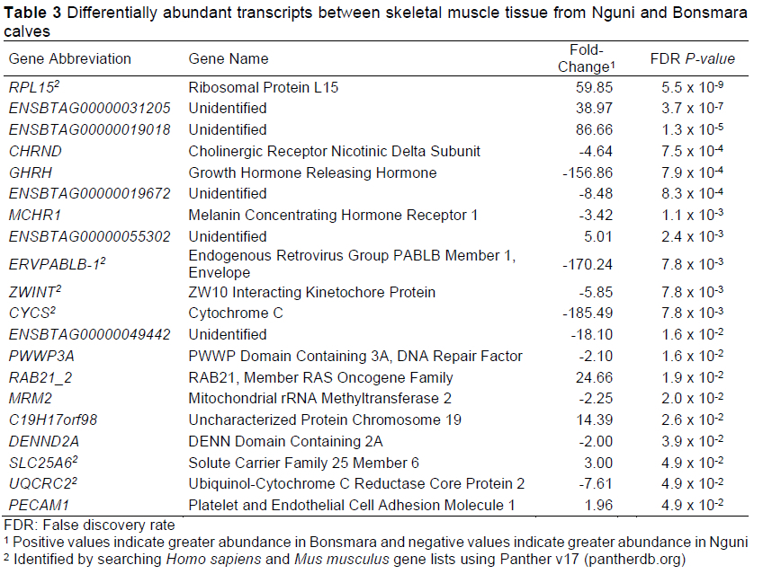 Twenty genes were differentially expressed between Nguni and Bonsmara breeds, with 12 of these being more abundant in Nguni (Table 3). Differences in transcript abundance may be correlated with phenotypic differences in tissue growth and function. However, transcriptome differences should not be over-interpreted. Differences in transcript abundance do not always result in different protein abundance nor do they necessarily cause changes in phenotype. In this work, the transcripts were mapped to the genome and differences in gene expression were then quantified at the gene level. These gene transcripts corresponded to functions associated with ATP production and mitochondrial function, growth, appetite stimulation, and ribosome and cytoskeletal structure (Clark et al, 2016).