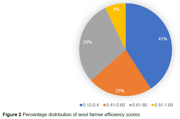 Figure 2 shows the technical efficiency scores for the sampled wool farmers in the study area. The technical efficiency scores ranged between 0.12 and 1.00, with a mean efficiency of 0.95. The average technical efficiency score of 0.95 suggests that the average wool farm in the sample requires ~5% additional resources to get to the frontier. In other words, wool producers in the study lost an average of 5% of output due to technical inefficiency. These results are comparable with those found in a study by Danso-Abbeam et al. (2017) on the adoption of agrochemical management practices among smallholder farmers in Ghana, where they found mean efficiency scores of 0.91 and of 0.83 for both adopters and non-adopters of agrochemicals, respectively.