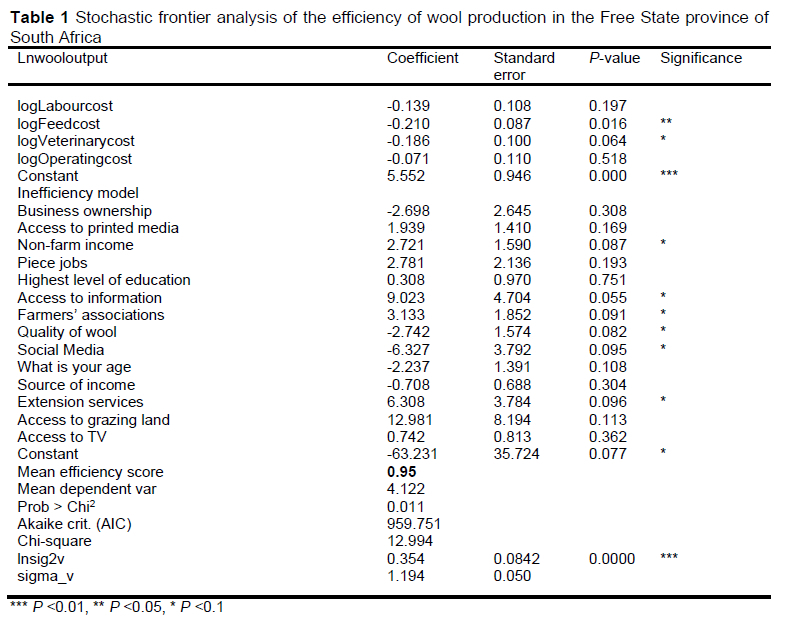 The estimated coefficients of the determinants of technical inefficiency among wool farmers in the study area are also reported in Table 1. It was important that the variables used in the model represent the factors influencing technical inefficiency. Hence, a negatively signed variable increases farmers' technical efficiency and vice versa. Identifying these sources of technical inefficiency is imperative for effective policymaking.