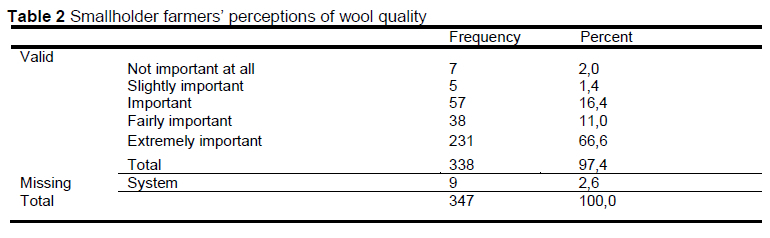 The results from Table 1 indicate that the coefficient of wool quality is negative and has a statistically significant influence on the variation in the efficiency of wool production. This implies that the better the quality of wool, the higher the probability of production efficiency (i.e., inefficiency decreases). This can be attributed to the fact that better wool quality means a better wool price and increased farming income. Most (66.6%) of the smallholder farmers in the study indicated that the quality of the wool they produce is extremely important, while 2% of farmers indicated that they do not consider the quality of wool to be important at all (Table 2). This shows that there is a need to educate farmers on the importance of wool quality in terms of the overall efficiency of their wool production.