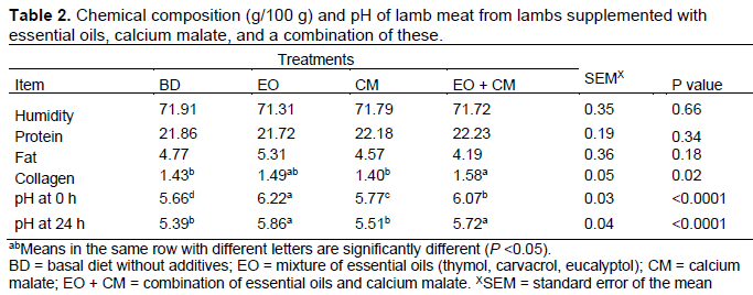 There were no differences in meat moisture, protein, and fat content (P >0.05) between treatments (Table 2). The average values concurred with those reported by Junkuszew et al. (2020), and the absence of effects of EO or CM concurred with those reported by Yagoubi et al. (2018), Smeti et al. (2018), and Rivaroli et al. (2016) in cattle; and by Haro et al. (2020) in lambs. It is likely that the amounts used of the additives were not sufficient to substantially modify ruminal fermentation to affect the rate of fat or muscle protein deposition (Malekkhahi et al., 2015). Collagen is the most abundant protein molecule in the body and maintains the health of the muscles. It is important to determine collagen content as it varies depending on the breed, productive aptitude, precocity, and age of the subject. In animals with a high growth rate, the rate of protein and collagen replacement is high (Rivaroli et al., 2016). In this study, collagen content was lower (P <0.05) in the BD and CM groups than in the EO or EO + CM groups, which may be related to the lower weight gain of lambs supplemented with these same additives (Ortiz et al., 2021).