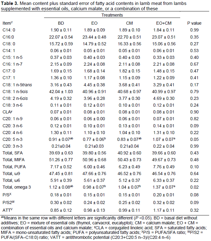 There were no differences (P >0.05) between groups in the total fatty acid content of lamb meat. No differences (P >0.05) between groups were observed in the content of saturated, mono-unsaturated, or polyunsaturated fatty acids between treatments (Table 3). However, the content of C20: 5 n-3 and omega 3 in the group with EO+CM was higher (P <0.05) than in the group with EO, but there were no differences (P >0.05) in the total content of omega 6 fatty acids or omega 9 between groups.