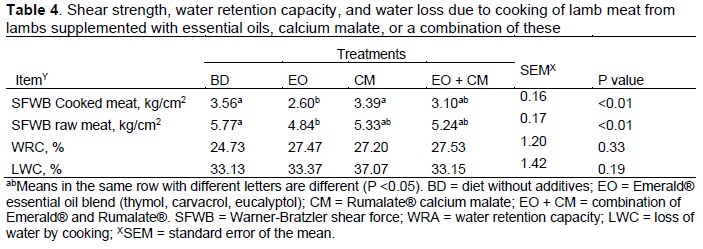 The shear strength of cooked meat from lambs supplemented with EO was lower (P <0.05) than in the BD or CM groups but similar to the EO+CM group. The shear strength of raw meat in the BD group was higher (P <0.05) than in the EO group but similar to that of the other groups (Table 4).