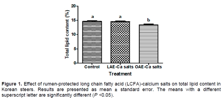 Previous studies have recognized that LCFA-Ca salts have a positive impact on small ruminants and dairy cows. Feeding calcium salts of FAs (vegetable oils) increased milk yield and quality in cows (Purushothaman et al., 2008; Andrés et al., 2013) and meat quality, such as linoleic acid concentration, in Bali cattle (Bain et al., 2016). However, several studies have shown inconsistent results regarding the use of fats in cattle and sheep (Obeidat et al., 2012) and a limited number of studies have examined the effect of feeding LCFA-Ca salts on Korean steers. Therefore, the aim of this study was to determine the effects of LCFA-Ca salts on lipid content, FA profiles, and related gene expression, all of which affect meat quality.