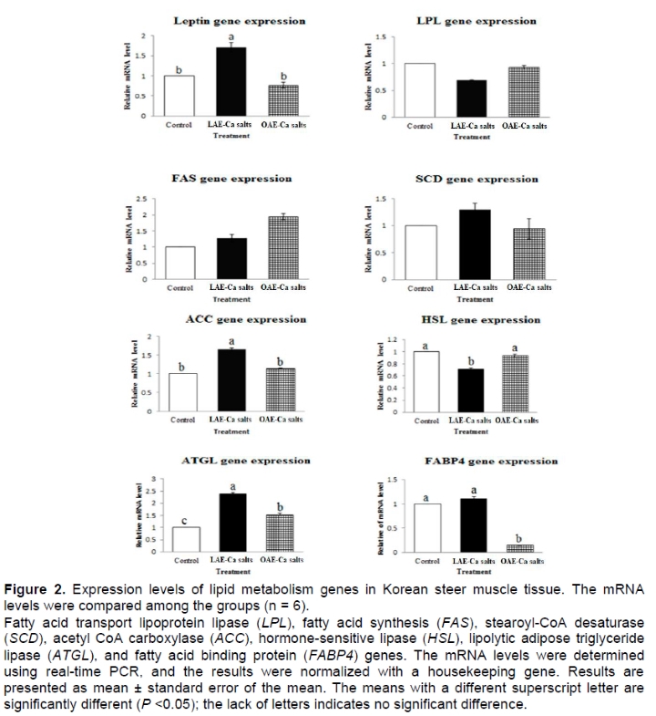 In conclusion, our findings suggest that the addition of linoleic and oleic acid-enriched calcium salts to the diets of Korean steers alters the lipid content and fatty acids; the expression of ACC, ATGL, and FAS genes is increased. Moreover, diets (linoleic and oleic acid-enriched Ca salts) can affect fatty acid composition and related gene expression. Further research is warranted to investigate this association.