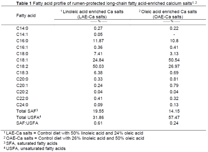 Fat is the most important energy source in animal diets and is supplemented to increase the energy density of rations. Long-chain fatty acids (LCFAs) are physiologically important because they combine to form triacylglycerols and provide energy storage in the adipose tissues of animals. Calcium salts of LCFAs comprise FAs complexed with calcium ions, which makes them insoluble (Frank et al., 2022), prevents problems associated with rumen microbial fermentation and digestion, and have been widely used as a rumen-protected fat in dairy and beef production (Jenkins & Bridges, 2007). Supplemental fats of different origins are used to improve the energy density of ruminant diets. Dietary supplementation with FA calcium salts generally has no or a slight antagonistic effect on dietary digestibility in ruminants (Bain et al., 2016).