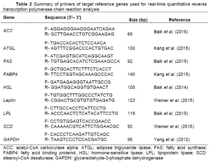 Real-time quantitative reverse transcription polymerase chain reaction (qRT-PCR) was performed using SsoFastTM EvaGreen® Supermix (Bio-Rad,) and a CFX96TM Real-Time PCR detection System (Bio-Rad). The cDNA was amplified from each gene, and the reaction was carried out according to the manufacturer's instructions (Bio-Rad). Briefly, PCR was conducted in a 20 μL total reaction volume containing 100 ng cDNA, 10 μl SsoFastTM EvaGreen® Supermix, and 1 μL of 10 pM primers. First-strand cDNAs, as templates, and gene-specific primers were used to amplify genes encoding for leptin, LPL, FAS, SCD, ACC, HSL, ATGL, FABP4, and GAPDH (Glyceraldehyde-3-phosphate dehydrogenase) (Table 2). The thermal cycling parameters were: 95 °C for 2 min, followed by 40 cycles at 95 °C for 5 s, 59 °C for 5 s, and 65 °C for 5 s. The AACT method was used to determine the relative fold-changes, and all data were normalized with the housekeeping gene, GAPDH. Statistical analysis of the real-time PCR results was performed using the Ct values (Ct gene of interest - Ct reference gene). The conversion between AACt and relative gene expression levels was: Fold induction = 2-ΔΔCt, where 2-ΔΔCt is relative gene expression (Livak and Schmittgen, 2001).
