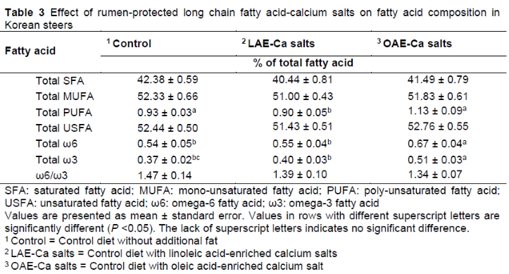 In the OAE-Ca salt group, palmitic acid (C16:0) and linoleic acid (C18:3) increased. A similar response was observed by Chilliard et al. (1986), who showed that feeding LCFA calcium salts increased the percentages of palmitoleic acid (C16:1) and linoleic acid (C18:3) in milk. Bhatt et al. (2015) showed that FA calcium salt supplementation substantially increased serum non-esterified fatty acids (NEFA) over 90 d, but their content dropped to intermediate levels over 180 d. De Smet et al. (2004) also reported that the fatty acid composition of meat was influenced to a greater extent by dietary rather than genetic factors. Thus, our results indicate that OAE-Ca salts can be added to the diet of Korean steers to enrich meat with FAs beneficial to health.