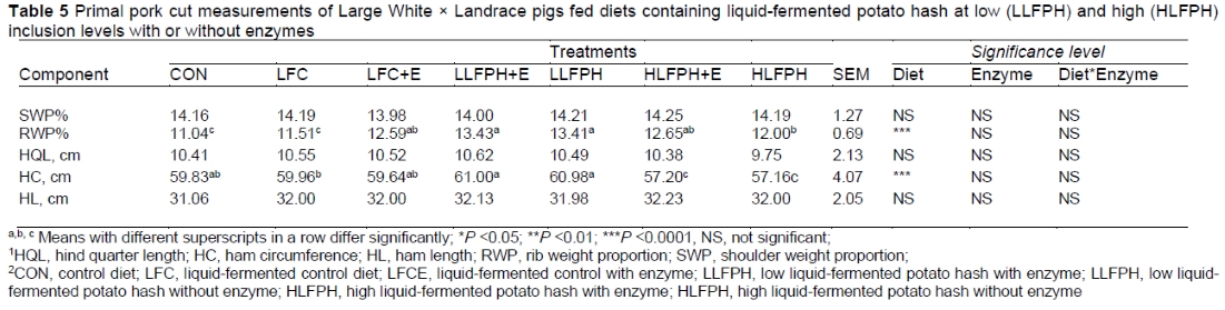 Experimental diets did not influence the length of the carcass in the study. Carcass length affects the weight of the most valuable meat cuts (Poto et al., 2007) and determines the amount of rashers of back bacon obtained (Kanengoni et al., 2014). English et al. (1988) stated that carcass weight and the genotype of the pig largely influence CL. The control and fermented-liquid control diets with or without enzyme had more subcutaneous fat than the low and high liquid-fermented potato hash diets with or without enzyme; this was demonstrated by a lower lean percentage. Different inclusions of fermented liquid potato hash with or without enzymes reduced back-fat measurements. Back-fat thickness, P2, and shoulder fat measures were lower on the fermented-liquid potato hash diets with or without enzyme, compared to the control and fermented-liquid control diets. Inclusions of liquid-fermented potato hash diets with or without enzyme, however, did not negatively affect some commercially important pork cut measurements of the hindquarter, ham length, and shoulder. The hindquarter length, circumference, and weight and the shoulder weight measures were affected mainly by diet.