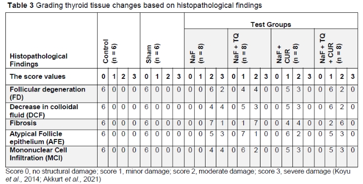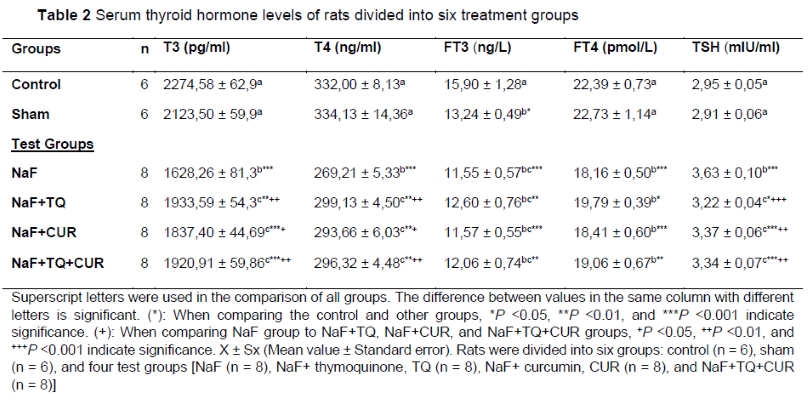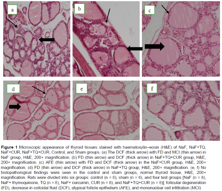 Fluoride is present in high concentrations in some regions of the world in groundwater, vegetation, and soil (Johnston & Strobel, 2020). Fluorosis affects skeletal parts of the body, the brain, liver, kidney, thyroid, and spinal cord tissues in humans, animals, and birds that inhabit these regions (Shahab et al., 2017). The thyroid gland and its hormones play a critical role in regulating the development, differentiation, and metabolism of all mammalian tissues (Zhan et al., 2006). The lack of research on the effects of combined use of TQ and TQ+CUR on the thyroid gland and hormones in fluoride poisoning led us to conduct this study. The purpose of this study was to determine what kind of structural and histological changes occur in the thyroid glands of rats exposed to NaF, as well as how thyroid hormones are affected, and whether the combination of TQ, CUR, and a TQ+CUR has protective or therapeutic effects.