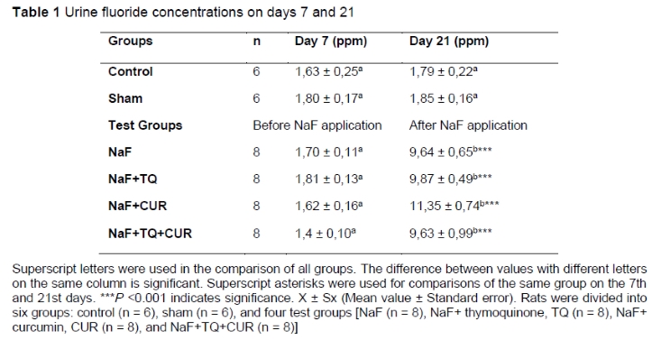 In the control and sham groups, no significant statistical difference could be detected in the urine fluorine concentration on days 7 and 21. When the urinary fluoride concentrations on the seventh day before NaF administration and the 21st day after NaF administration were compared in the test groups, a statistically significant increase in the urine fluoride concentration after NaF administration was found. Urinary fluoride concentrations did not differ between the test groups (Table 1).