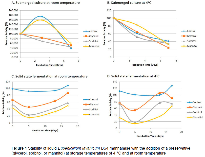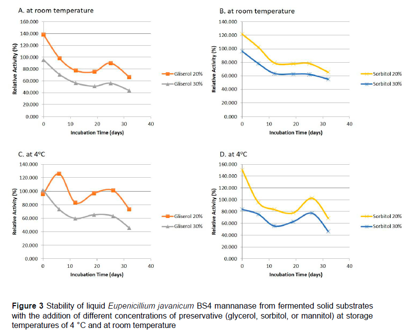 To increase the digestibility of mannan, mannanase can be used to hydrolyse mannan. Mannan is a polysaccharide hydrolysed by endo ß-mannanase (1,4-ß-D-mannan mananohydrolase [EC 3.2.1.78]) and exo-ß-mannosidase (ß-D-mananopiranoside hydrolase [EC 3.2.1.25]) to mannose. Purwadaria et al. (2003) produced mannanase using Eupenicillium javanicum BS4 submerged in minimal media containing coconut meal as an inducer in Erlenmeyer flasks. Enzyme storage can result in a decrease in enzyme activity. Prevention of decreased enzyme activity can be achieved using preservation methods. Enzyme preservation can be done using two methods, solid or liquid preservation (Purwadaria et al., 2003; Rodríguez-Fernández et al., 2013). Rodríguez-Fernández et al. (2013) used variations in glycerol with storage time to preserve liquid phytase resulting from solid state fermentation. The results of the study indicated that the storage temperature and concentration of the preservative affected the stability of the enzyme. Glycerol and polyols (sorbitol and mannitol) are compounds that can inhibit the rate of enzyme reactions. In the current study, preservation agents were used (glycerol, mannitol, and sorbitol) to maintain enzyme activity when stored at room temperature and at 4 °C. Liquid enzymes were used as research objects because they are easier to apply directly to feed. This study aimed to evaluate the stability of liquid E. javanicum BS4 mannanase resulting from solid state fermentation with the addition of preservative agents (glycerol, sorbitol, and mannitol) at storage temperatures of 4 °C and room temperature. The results of saccharification can be used as a parameter in the field for determining enzyme addition to feed containing high palm kernel meal.