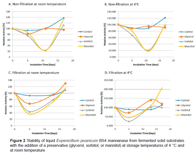 The results of the mannitol and sorbitol treatment decreased activity by more than 50% after incubation for 5 d. Enzymes resulting from solid state fermentation were used as test materials in the second experiment. The filtration treatment yielded more stable results with the addition of sorbitol and mannitol (Fig. 2) compared to the non-filtered results. However, in both treatments, it was not possible to determine the half-life of the enzyme because there was an increase in enzyme activity that could not be explained. The results of the addition of mannitol and sorbitol tended to have similar results. However, mannitol had low water solubility, so could not be stored at concentrations above 22%. Accordingly, glycerol and sorbitol were used for the last experiment.