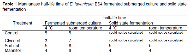 Mannanase E. javanicum BS4 half-life was calculated using the log curve of enzyme activity and incubation time (y = ax+b), followed by determination using Equation 3.