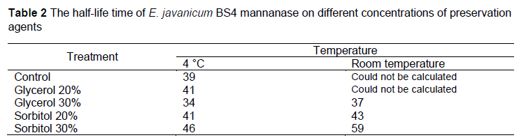 The determination of the best preservative was carried out by calculating the half-life of the enzyme. Enzyme half-life was determined after enzyme preservation for 32 d. Table 2 shows that the preservative can extend half-life and storage at 4 °C better than storage at room temperature. However, at 4 °C, there was an increase in enzyme activity in the control and 20% glycerol so the half-life of the enzyme could not be calculated.