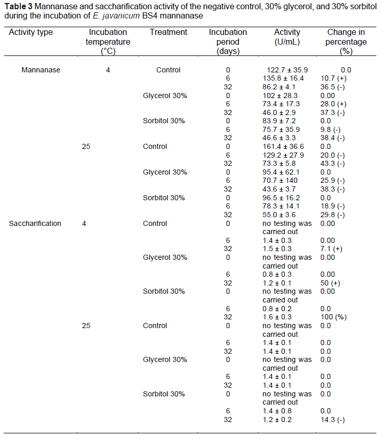 Table 3 illustrates the comparison between mannanase and saccharification activity on days 0, 6, and 32. Saccharification activity on day 0 was not calculated so changes in activity were obtained from activity data on days 6 and 32. Mannanase activity at these three points experienced a decrease in activity at 4 °C and room temperature. There was an increase in saccharification activity in all treatments incubated at 4 °C, whereas at room temperature, there was an increase in activity only with the use of 30% sorbitol. Mannanase activity in the control at the beginning of storage was higher than activity with the addition of a preservative. In the preservative treatments, a comparison of the preservative with the enzyme was carried out at a ratio of 30:70. In the control, the enzyme was 100%, whereas with the treatment, only 70% of the enzyme was used.