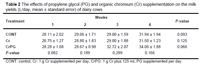 In this study, the effects of supplementation with Cr and Cr in combination with PG on various blood and milk parameters in early lactation dairy cows were examined. Dairy cattle face significant metabolic challenges during early lactation (Overton & Waldron, 2004). The prepartum period can be considered the preparatory phase for the development of metabolic diseases, whereas the postpartum period is when these diseases manifest clinically or sub-clinically (Grummer, 1993; Grum et al., 1996). Additionally, as milk yield increases, the severity of the negative energy balance also increases, leading to a higher incidence of these diseases (Drackley, 1999; Overton & Waldron, 2004). All the cows used in this study reached an average daily milk yield of 30 L/day within the first four weeks postpartum. Therefore, these animals were considered appropriate subjects for evaluating the results of the study, based on milk yield.