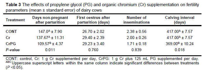 The number of days non-pregnant after parturition was significantly lower in the CrPG-supplemented cows than in the Cr and CONT cows. However, the number of days between parturition and first oestrus and the number of inseminations until pregnant were not affected (P >0.05) by the dietary treatments. The calving interval was shorter (P <0.05) in the CrPG cows than in the Cr and CONT cows (Table 3).