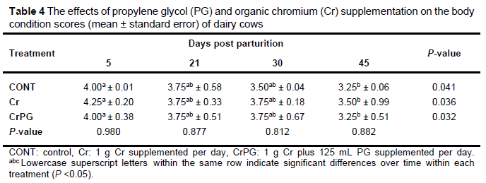 The effects of organic Cr and PG supplementation on the BCS of lactating dairy cows were measured after calving. No significant differences were observed between the treatments; however, significant differences within treatments were noted, indicating a decrease in the BCS as lactation progressed, owing to the increase in milk production (Table 4).