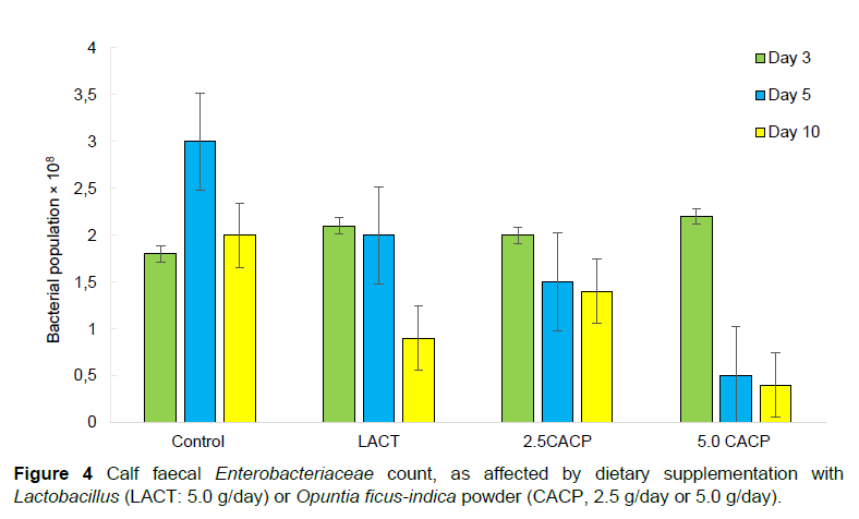 The faecal Enterobacteriaceae count decreased over time in the Lactobacillus and CACP-supplemented calves, but not in the control calves (P<0.05). Low Enterobacteriaceae populations were recorded for both the T3 and T4 calves (P <0.05). From day five to day 10, there were no significant changes (P >0.05) in the Enterobacteriaceae counts in the T3 and T4 groups; however, a marked change was observed in the T2 group (P <0.05).
