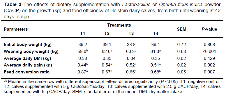 This study aimed to evaluate the effects of dietary prickly pear (Opuntia ficus-indica) powder and Lactobacillus supplements on calf growth and faecal pathogen counts. Prickly pear leaves were harvested, sun-dried for 14 days, and oven-dried at 105 °C, before grinding into a powder. Twenty-four female Holstein dairy calves (39.03 ± 0.75 kg live weight) were randomly assigned to each of the four treatment groups. The four treatments were: T1 : the control group, calves fed a basal diet (milk plus calf meal), without supplementation; T2: calves fed the basal diet plus Lactobacillus at 5 g/day; T3: calves fed the basal diet plus prickly pear powder at 2.5 g/day; and T4: calves fed the basal diet plus prickly pear powder at 5 g/day. These treatments were applied from four days of age until weaning. Calf starter feed and clean water were provided ad libitum for the entire study period. The dietary treatments affected the feed dry matter intake, feed conversion ratio, average daily gain, weaning weight, faecal total coliform count, faecal Escherichia coli count, and faecal Enterobacteriaceae count, compared to the control group. It was concluded that the dietary supplementation of Lactobacillus or prickly pear powder improves feed efficiency and body weight gain, as well as reducing faecal pathogen counts in Holstein dairy calves.