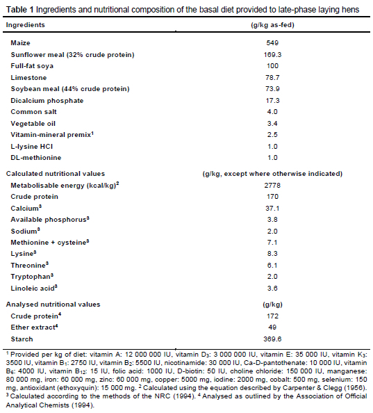 The study used 144 Babcock White late-phase laying hens, all of which were 62 weeks old at the start of the study. The mean initial body weight of the hens was 1603.05 ± 14.33 g. The hens were randomly divided into six groups of 24 hens each. Each group was further split into four replicates of six hens each. The study lasted for four weeks, and during this time, the laying hens were exposed to a light cycle of 16 hours of light followed by eight hours of darkness. The hens had unrestricted access to both feed and water. All groups were provided with a basal diet formulated according to the nutritional requirements of the birds, as outlined by the National Research Council (NRC, 1994). The composition of the basal diet is provided in Table 1. Drinking water was provided by a nipple drinking system attached to separate tanks for each group.