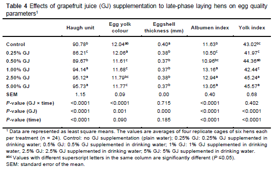 The composition of the grapefruit juice used in this study is shown in Table 2, and the effects of the grapefruit juice supplementation on the hens' performance parameters are shown in Table 3.