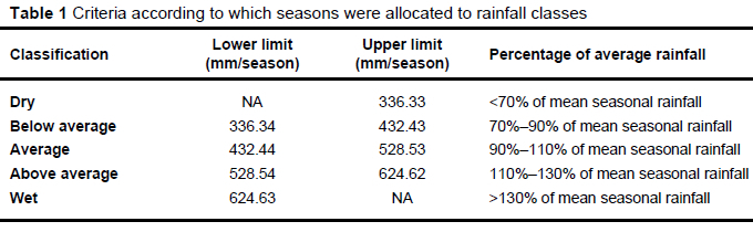 Production seasons were divided into five classes based on the total rainfall in the 12 months preceding mating, with the following classes being defined: dry, below average, average, above average, and wet. Average seasons were defined as seasons where rainfall was within 10% (either above or below) of the long-term mean seasonal rainfall. Above- and below-average seasons had rainfall between 10% and 30% above or below the average, respectively, and wet and dry seasons deviated more than 30% from the average. The exact cut-off points for each category are given in Table 1.