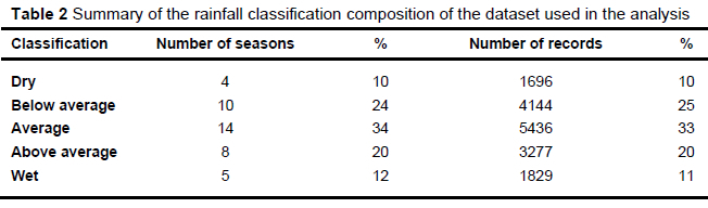 Table 2 and Table 3 summarise the structure of the complete dataset. As expected, the majority of the seasons (34%) were classified as average with regards to rainfall. Although only four and five seasons were classified as dry and wet, respectively, there were still enough individual records present to capture sufficient variation between age groups in these seasons to justify the analysis and validate any conclusions drawn from it.