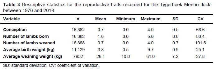 The production records used in this study were collected between 1976 and 2018 and included ewe measurements for the following traits: conception, number of lambs born (NLB), number of lambs weaned (NLW), average birthweight (ABW), and average weaning weight (AWW). Conception is a binary trait and is defined as whether mating resulted in the ewe carrying a foetus to term or not. The number of lambs born and weaned were calculated per ewe mated. Birth and weaning weights were calculated as the average weight born or weaned per ewe lambed. Because insufficient records were available for animals older than six years, only records for ewes between two and six years of age were retained. After removing duplicate and incomplete records from the dataset, 16 382 individual entries across 41 production seasons were included in the final dataset.