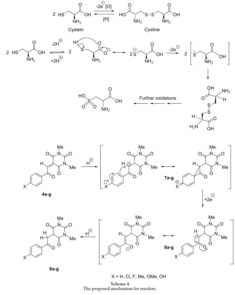 The proposed mechanism for reduction of 5-arylidene-1,3-dimethylbarbituric acid 4a-g by L-cysteine (5) in presence of phosphotungstic acid is shown in Scheme 4. The proton absorption by a,b-unsaturated triketones 4a-g forms the carbocations 7a-g with electron-deficient carbon near to aroyl group, which was changed to carbanions 8a-g by transfer of two electrons from cysteine and finally formed the desired trione 6a-g by absorption of the second proton. It seems that electron-donating substituents on arylglyoxals stabilizes the carbocations 7a-g formed in the first step, as the reaction with 4-nitro substituent failed to form the corresponding reduced triketone, due to destabilization of carbocations formation in the first step by electron-withdrawing effect of nitro substituent.